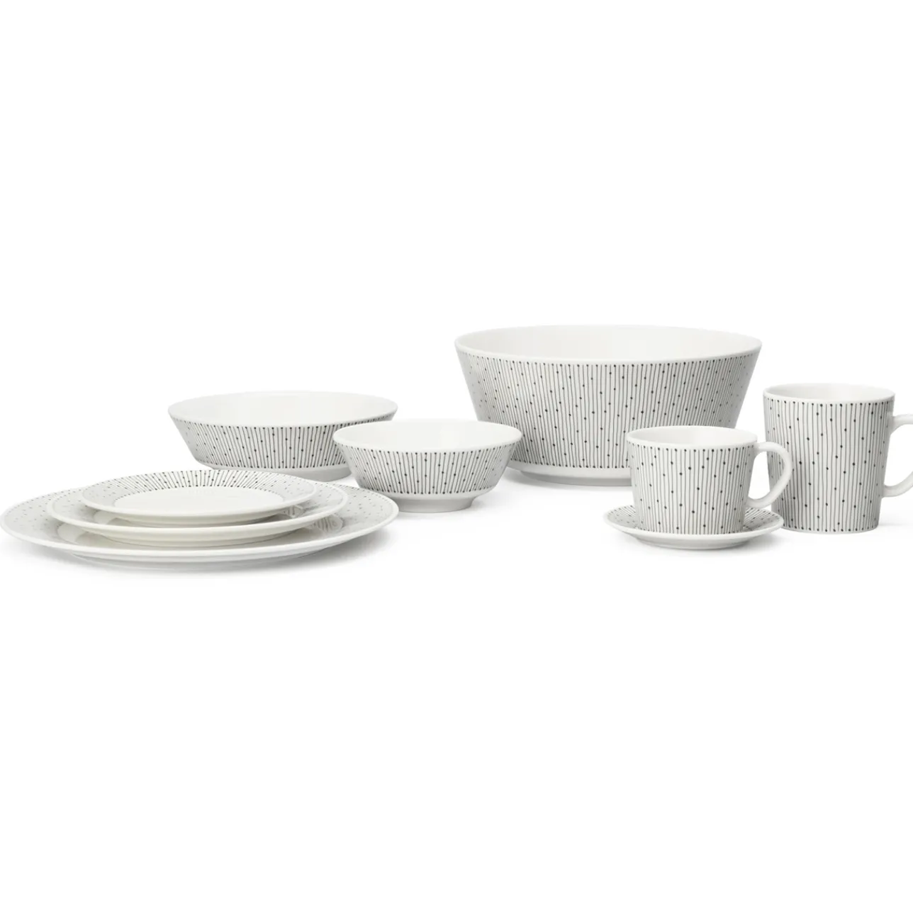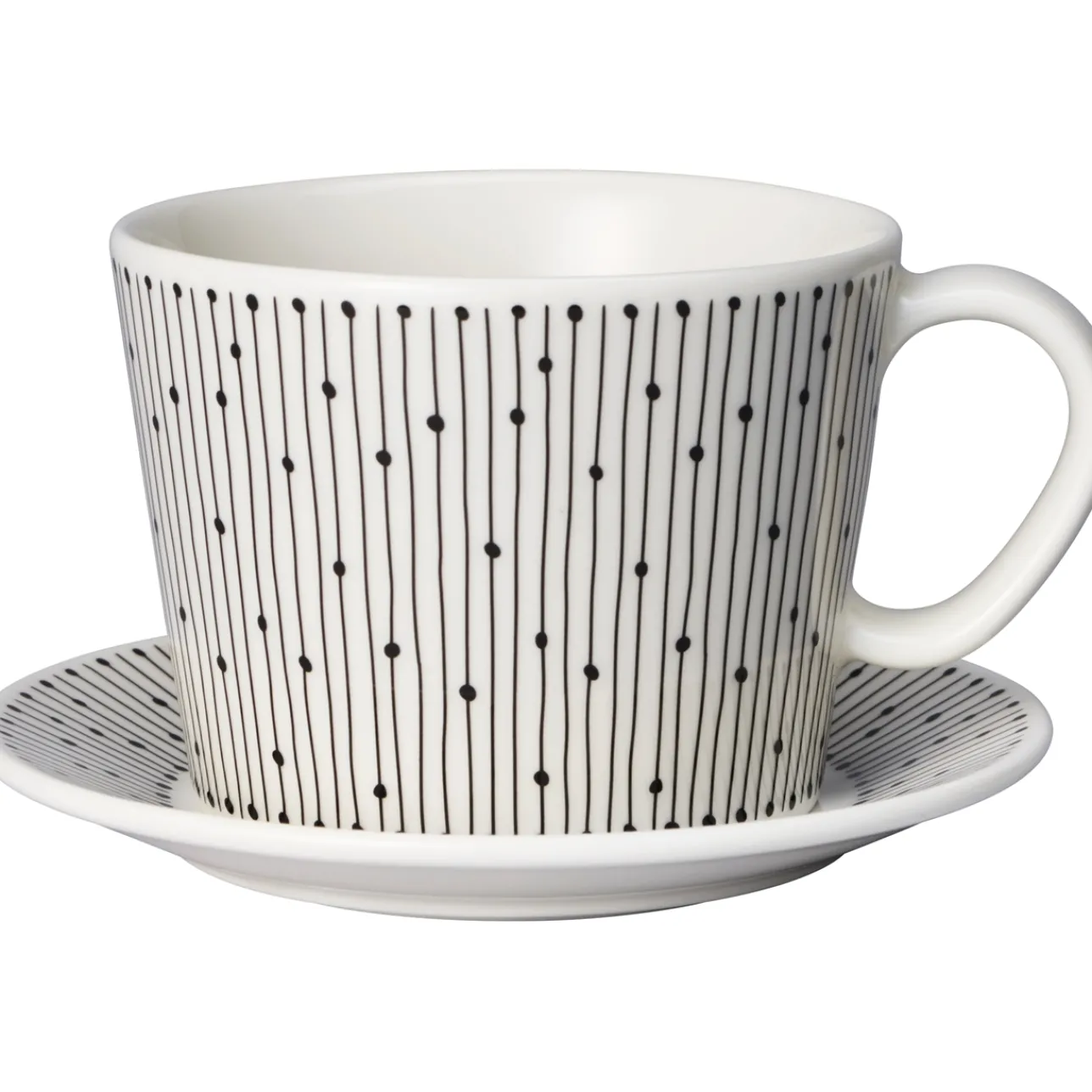 Halkaisijaltaan 11,5 cm lautasta koristaa graafinen mustavalkoinen kuvio. Arabian Mainio Sarastus on uusi monikäyttöinen astiasarja, joka sopii pieneenkin kotiin. Sarjan kaikki astiat toimivat näppärästi uunissa ja pakkasessa sekä menevät pöydästä pinoon.